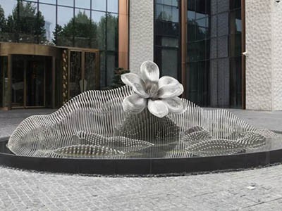 上海萬達(dá)瑞華酒店不銹鋼雕塑,名為蘭水韻,規(guī)格750x550x220cm。運(yùn)用線性藝術(shù)語言和空靈通透的藝術(shù)形式,表現(xiàn)了一朵典雅的玉蘭花綻放于水中之景,因此又叫水中花。
